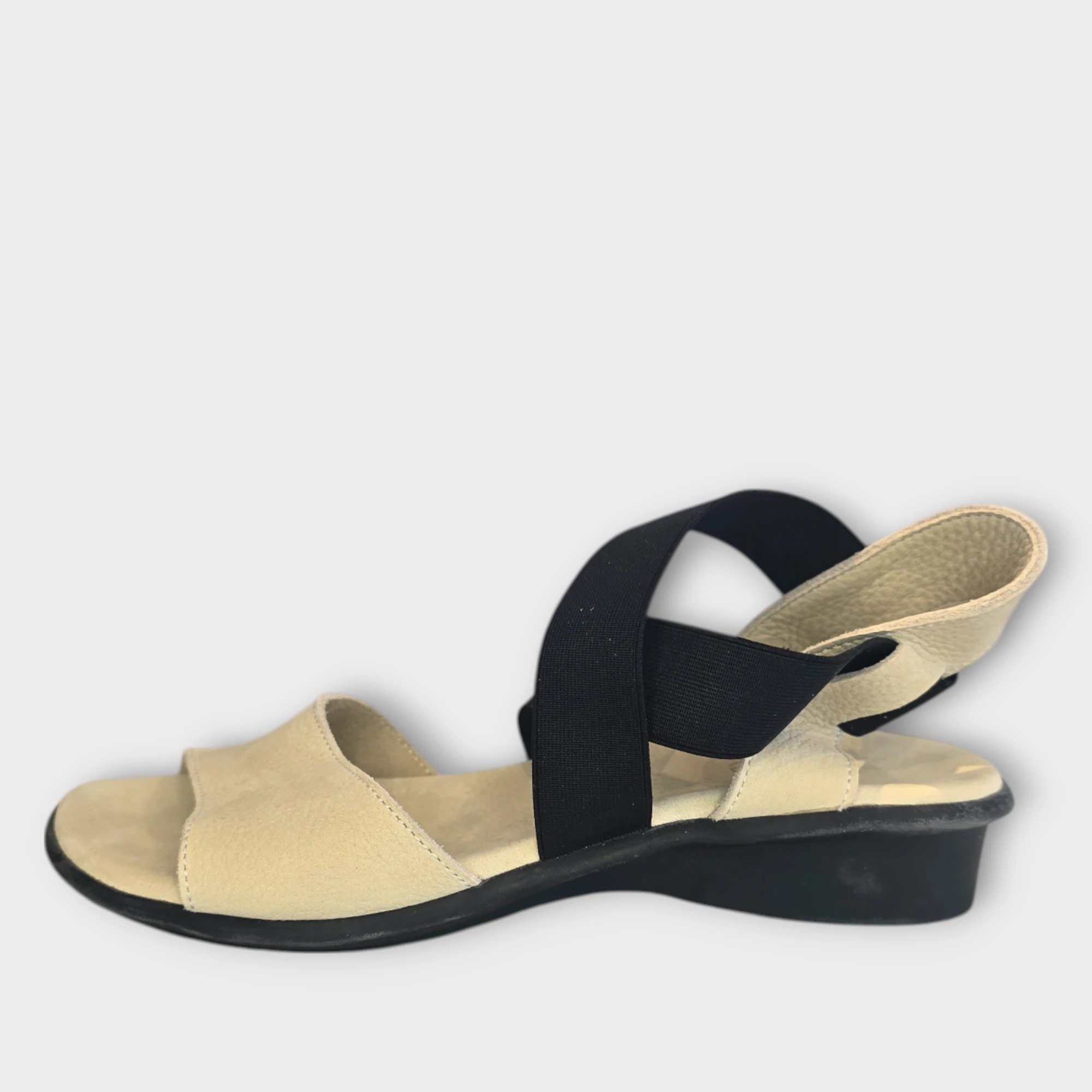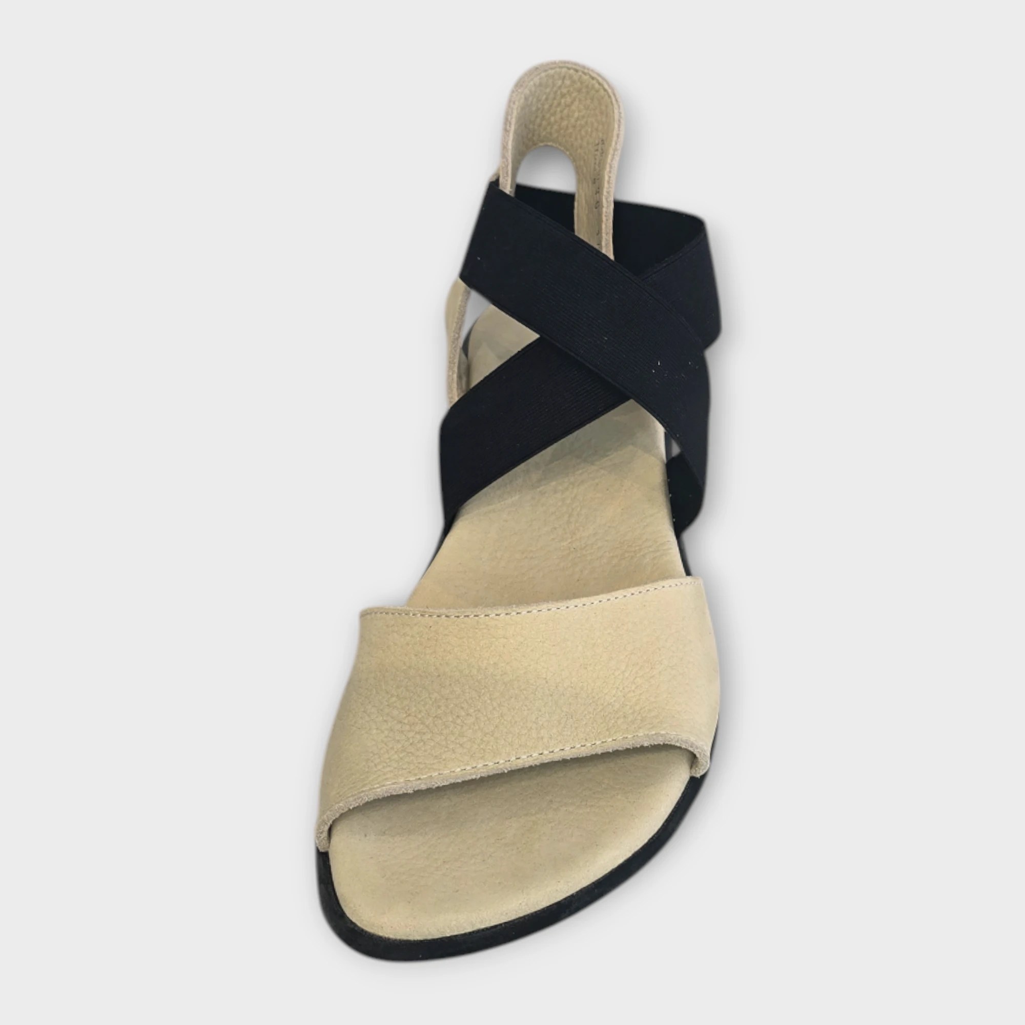 The Arche Satia sandal offers both style and comfort, featuring elasticated cross straps for a secure fit. These handmade sandals are crafted from premium nubuck leather and include a natural shock-absorbing latex outsole for maximum comfort. The leather is designed to stretch and conform to your foot.