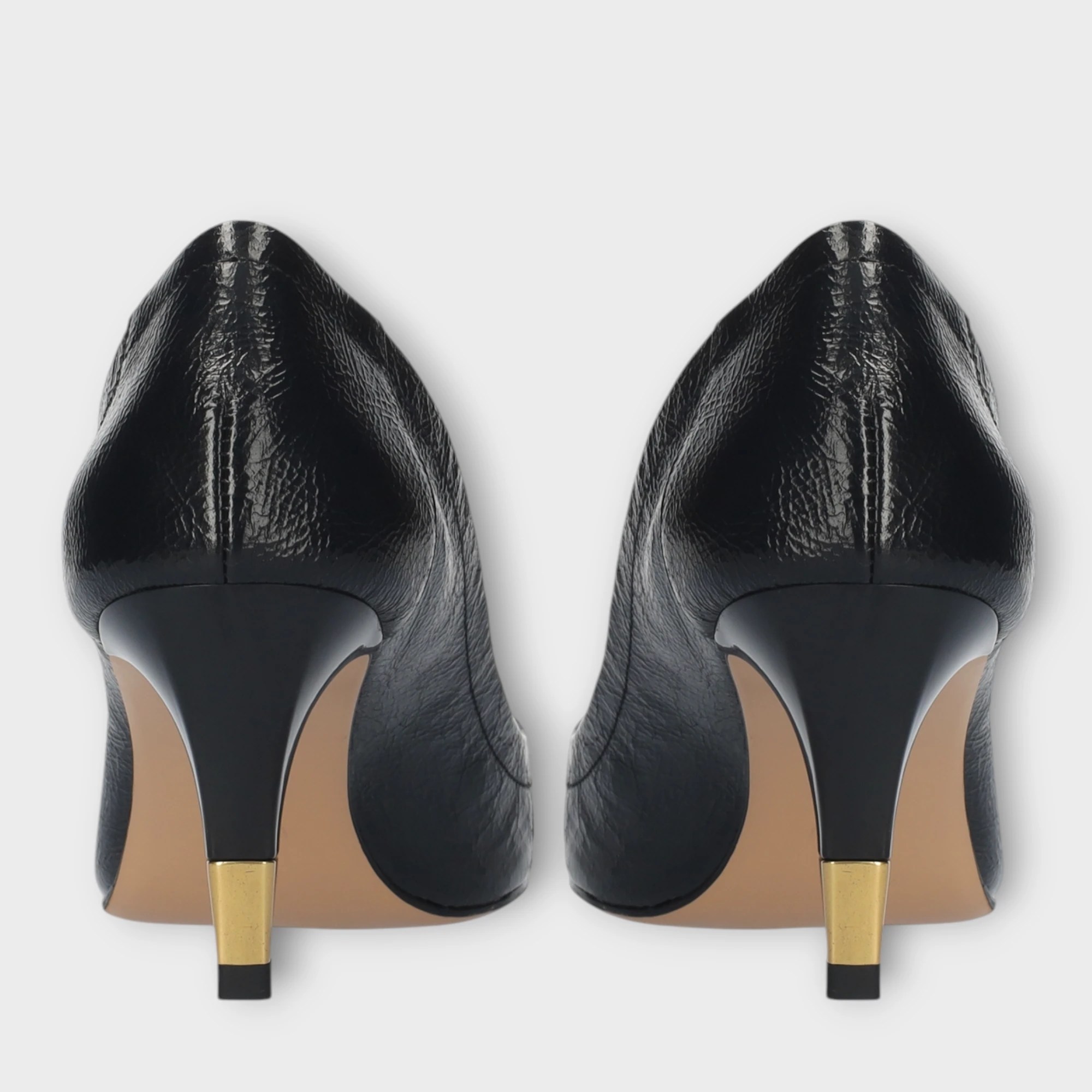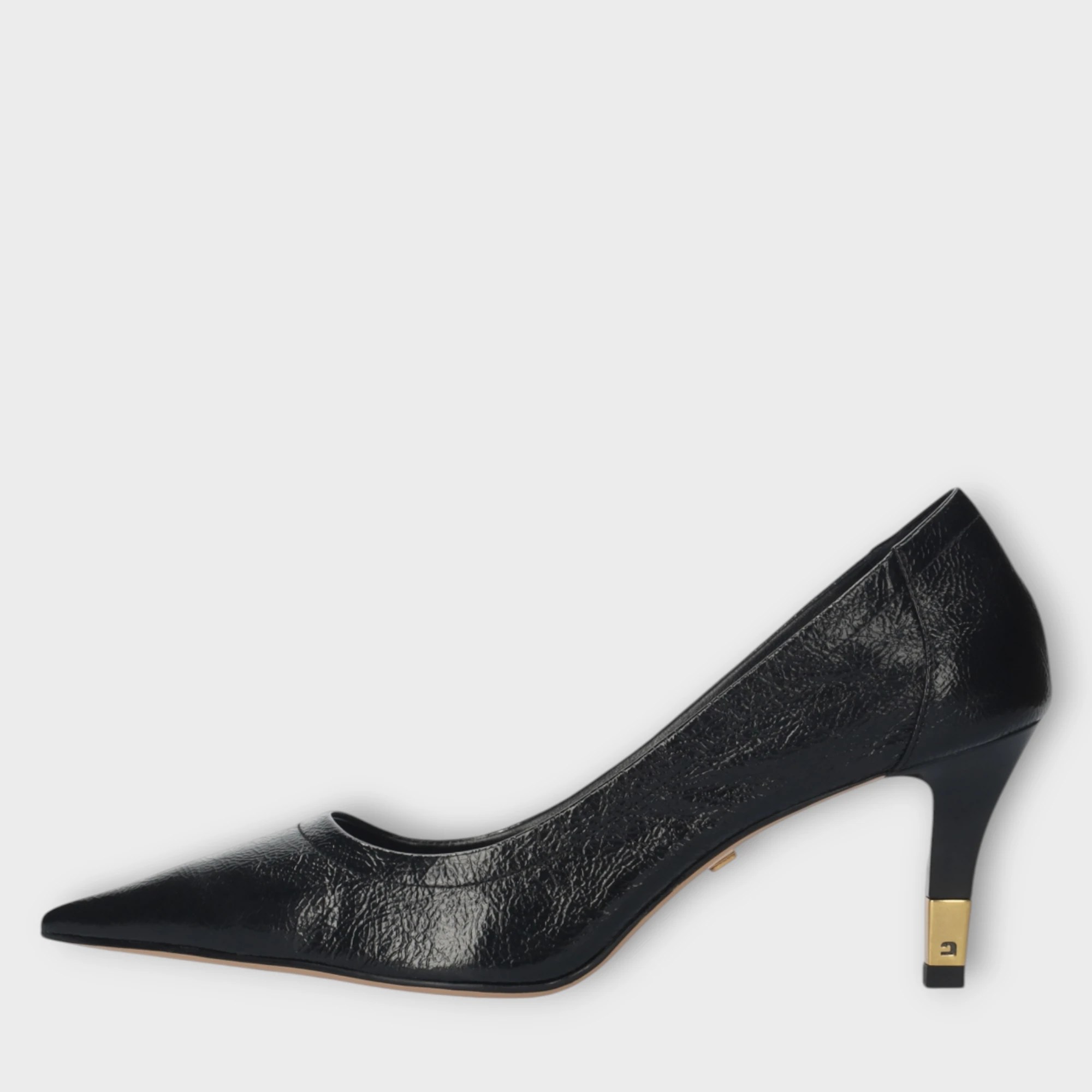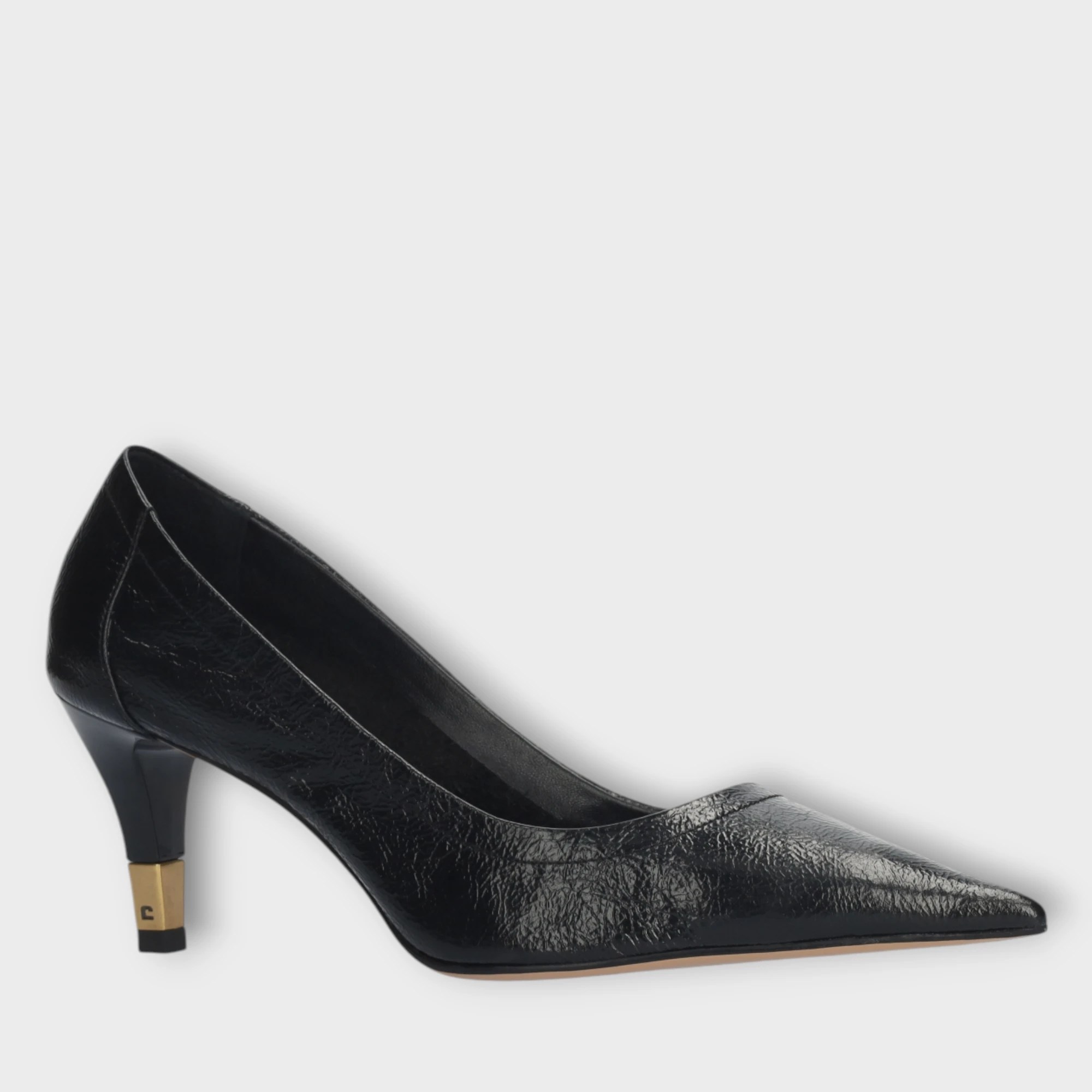 Lola Cruz women’s black leather pumps. Pumps with a croc print, pointed toe and gold detailing on an 6.5 cm stiletto heel.