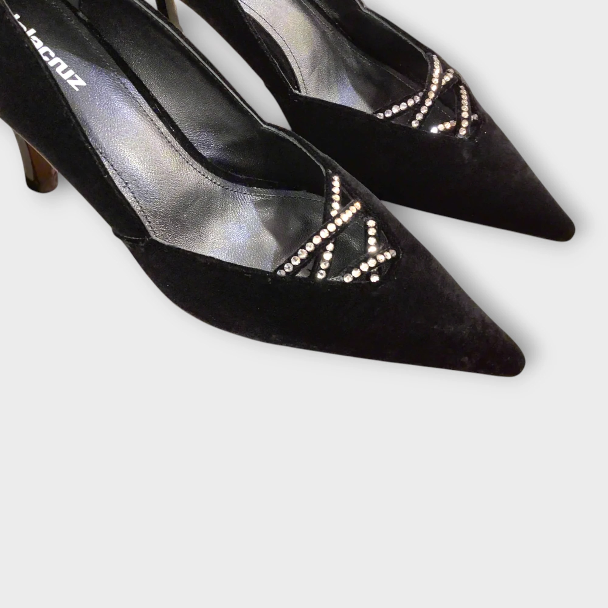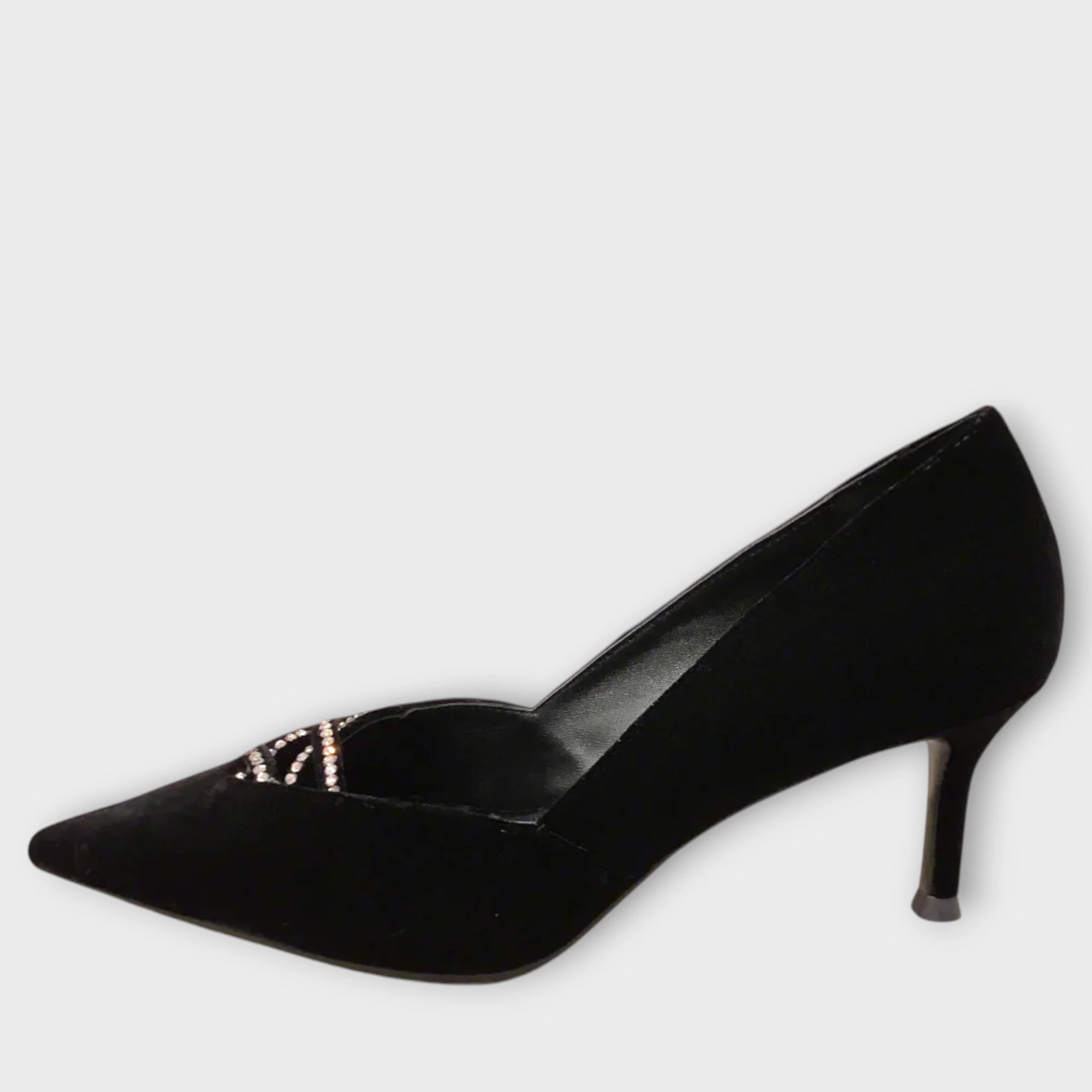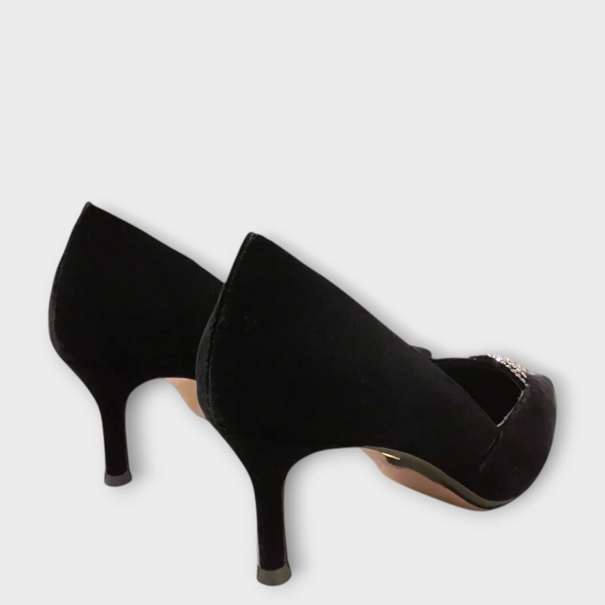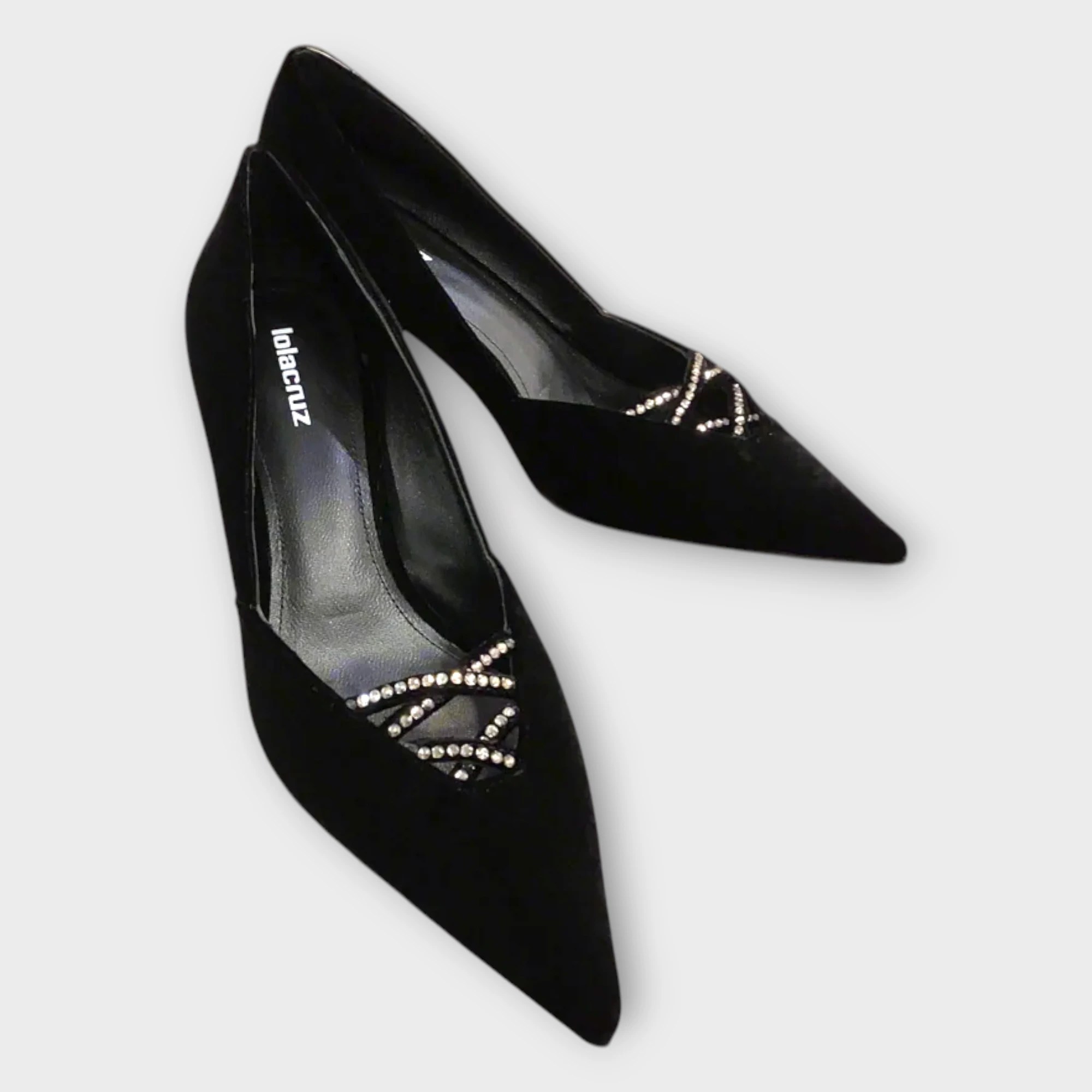 Lola Cruz women’s velvet pumps. Pump 65 model with pointed toe and 6.5 cm stiletto heel. Elevate your ensemble with the Lola Cruz court shoe, crafted in luxurious black velvet. Featuring an elegant criss-cross sparkle detail on the toe, this shoe adds a refined touch of glamour to any outfit. Perfect for sophisticated occasions, it combines classic style with subtle shimmer for a timeless, polished look.