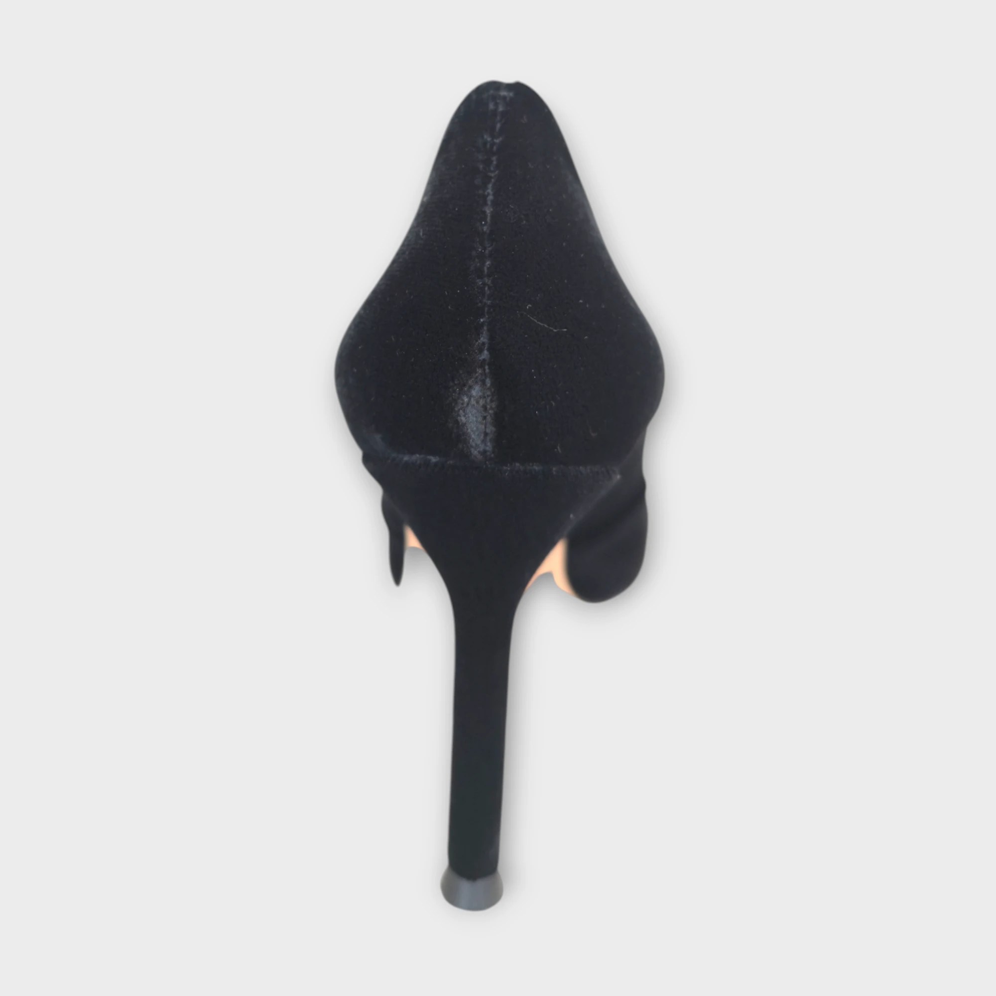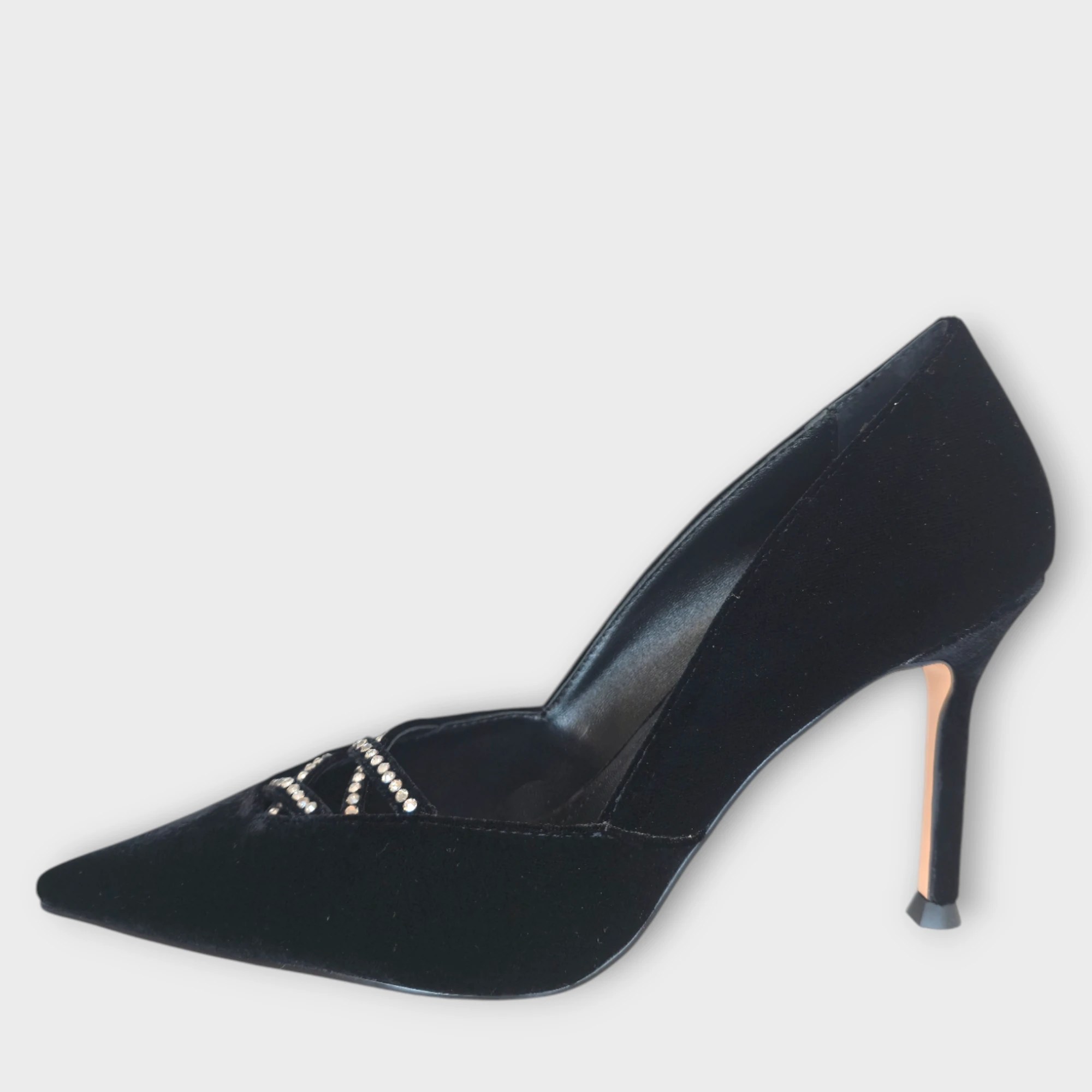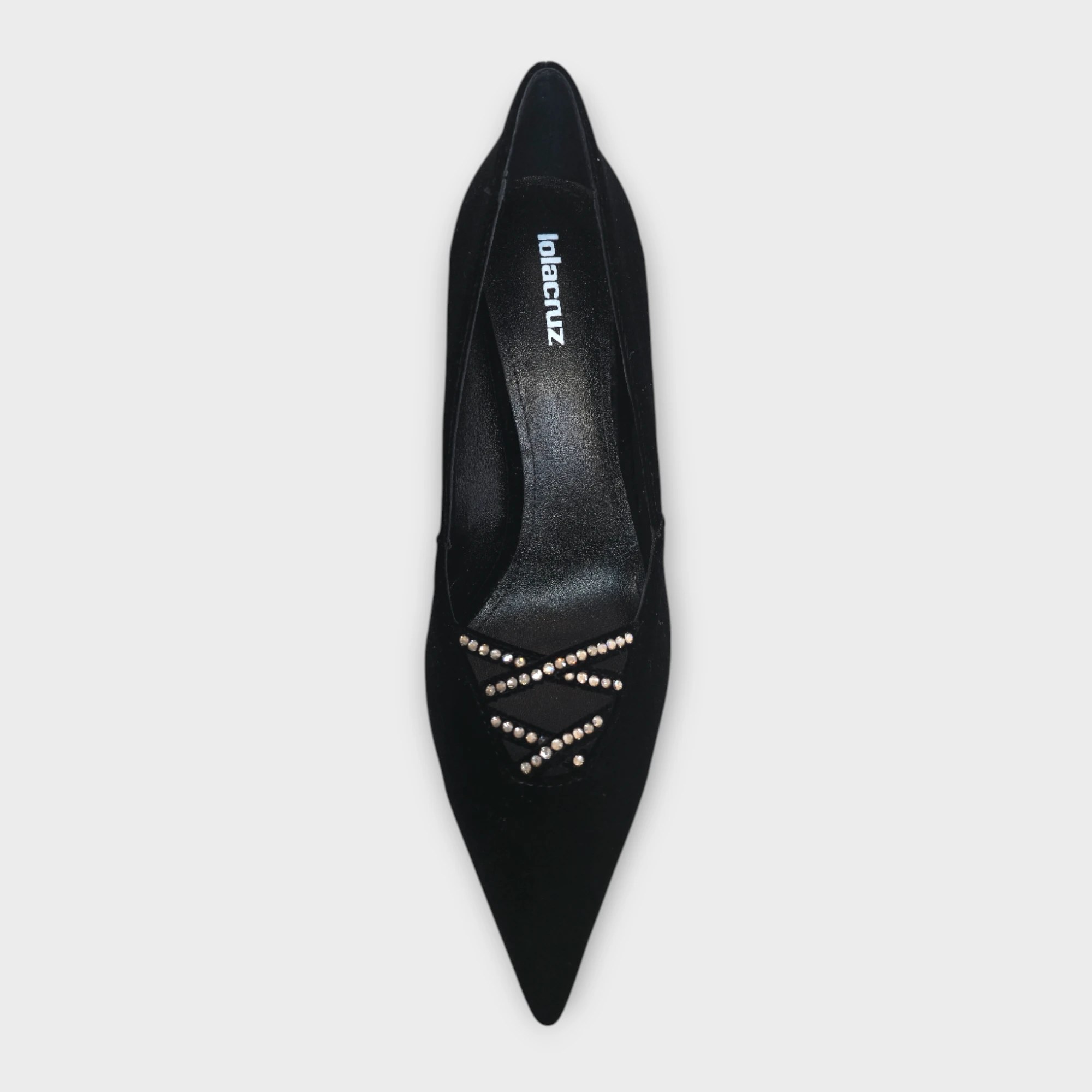 Lola Cruz women’s velvet pumps. Pump 85 model with pointed toe and 8 cm stiletto heel. Elevate your ensemble with the Lola Cruz court shoe, crafted in luxurious black velvet. Featuring an elegant criss-cross sparkle detail on the toe, this shoe adds a refined touch of glamour to any outfit. Perfect for sophisticated occasions, it combines classic style with subtle shimmer for a timeless, polished look.