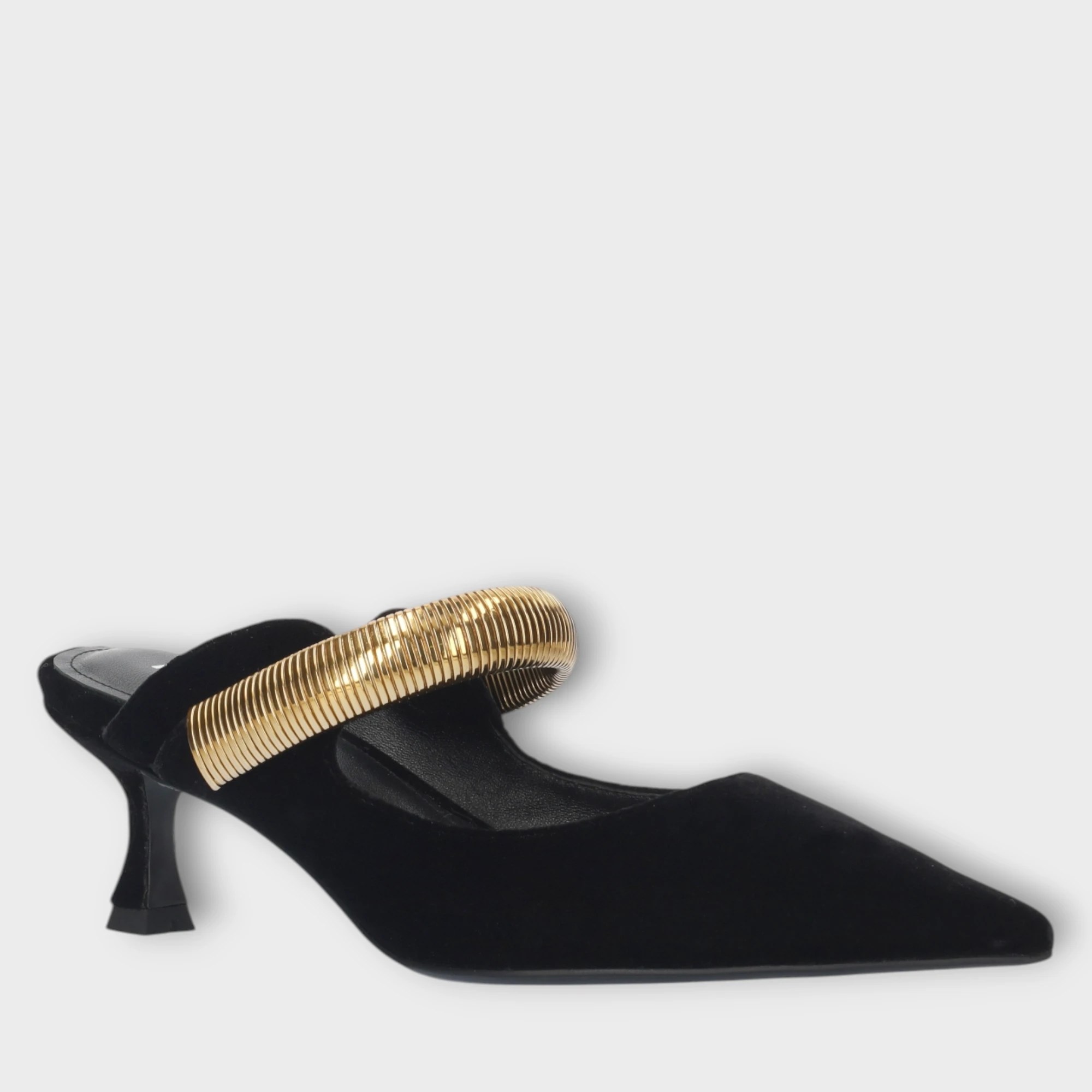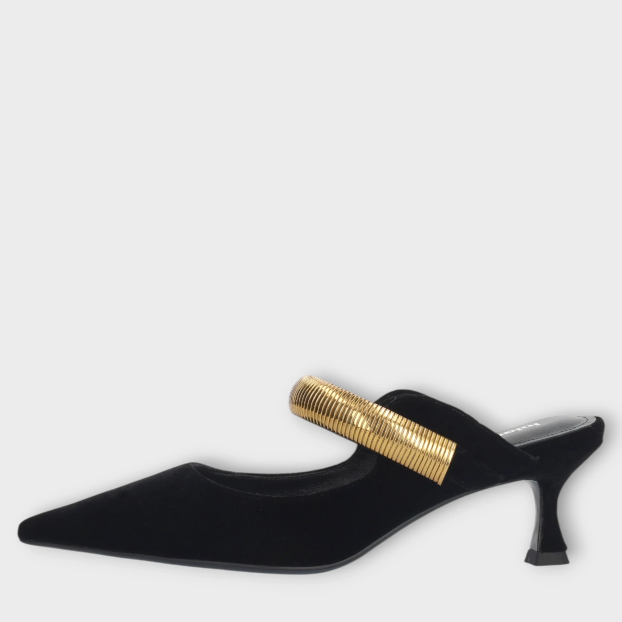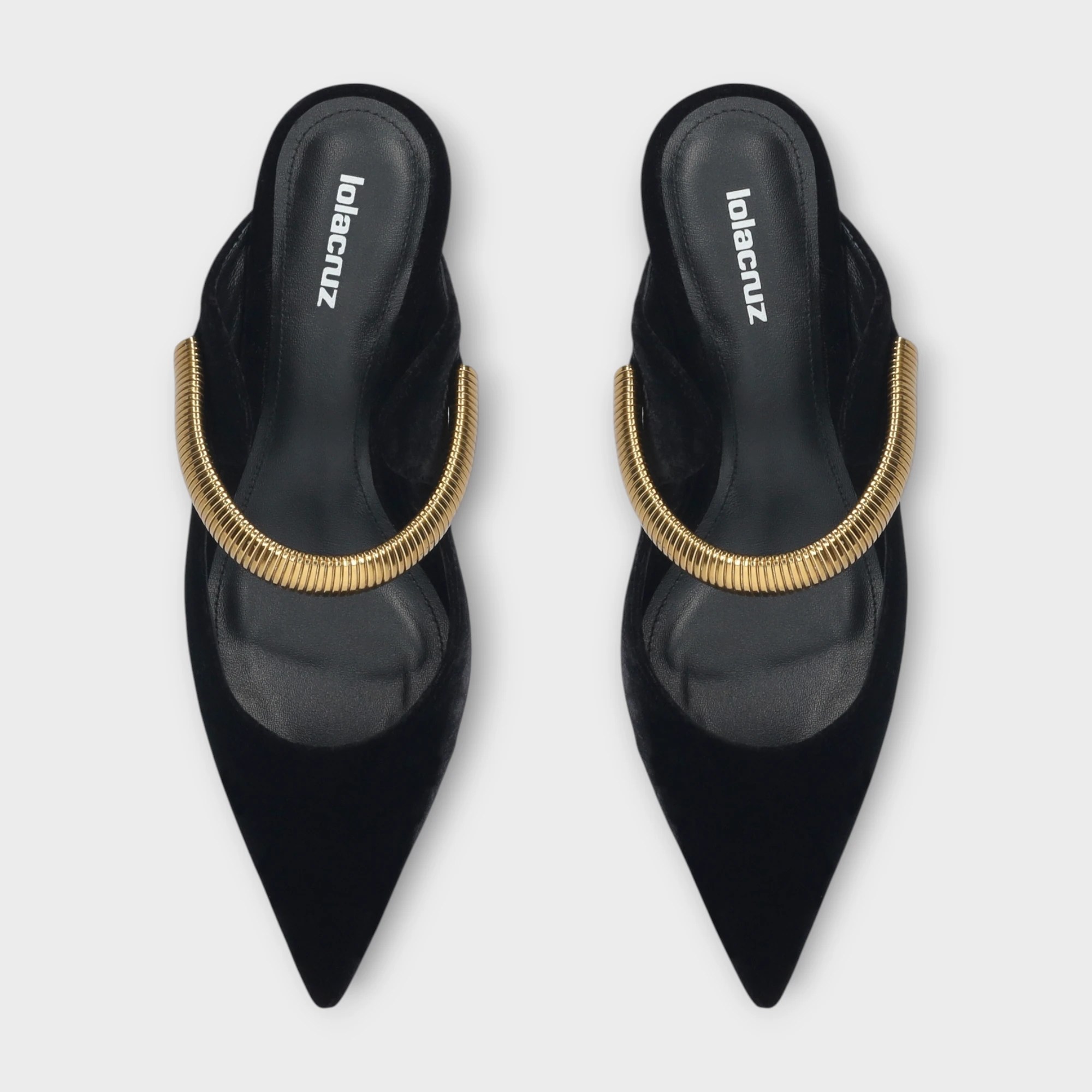 Women’s Lola Cruz Mules – Black velvet, gold applique, spool heel, leather/rubber sole.